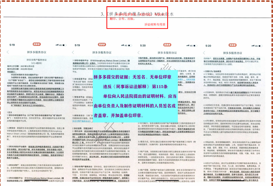 (2023)沪0105民初34997号 拼多多提供的六组证明材料,均无人员签名或盖章,更无单位印章。 证明材料目录封面  (1)【事实】第三组证明材料:3. 《拼多多用户服务协议》——无人员签名或盖章,更无单位印章。