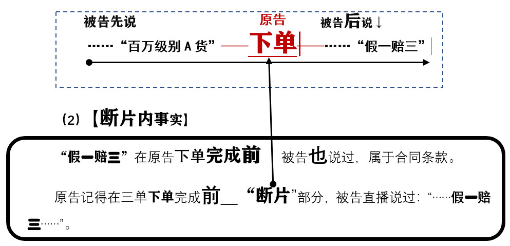 (1)《判决书》第16页 ④由此可见,原告系在被告时B陈述“达到百万级别、天然缅甸A货”之后即先后下单购买1199元的案涉商品三件,原告与被告时B达成的系三份“1199元购买达到百万级别天然缅甸A货”的合同,“假一赔三”系被告时B在与原告之间信息网络买卖合同已成立并生效后的陈述内容,故三百万违约金并不属于合同条款。||| 三百万违约金和“假一赔三”是一个意思的两种表达。 简化上文【下单】前后: