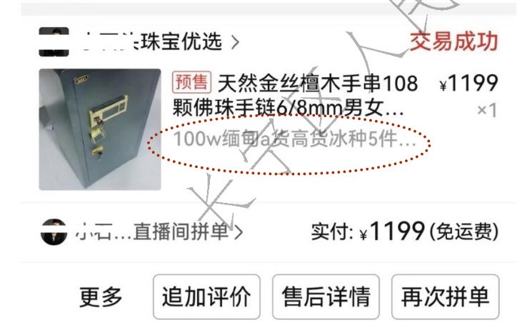 (1)商品链接图(购买者需同意并点击此图才能购买,签订合同) ② 关于100w含义_被比较价格 依据《上海市网络直播营销活动合规指引》第二十条(规范促销活动)应当明确标示或者通过其他方便消费者认知的方式表明被比较价格和销售价格。 本案属于商家促销活动: 《判决书》第9页,“直播间左上角显示:暴力打假!做真货太难了,再见了4年货盘,最后清仓!” ——“清仓”属于促销活动,最后清仓——更大的促销活动。 图中显示与直播间宣讲符合上海地方法规。 所以,“100w”是被比较价格,原价、实际价值(直播录像宣讲证据亦能证明),买家能看懂。 ③ 商品链接图内的文字展示要约部分内容,与主播口播和商品实物展示介绍的内容合在一起构成完整要约,用户选择该商品并提交订单成功时,合同成立。 ④ 这张图就是本案书面合同极简版,这是对所有购买者都一样的格式条款。 其包含的内容有:标的物(保险柜内),产地缅甸,品质a货高货翡翠,价值100w(w__万的网络表达方式),价款1199元。 商家宣传的要约内容条款对每位购买者都是一致的(包括主播口述和屏幕右下角商品联接图等),该条款被直播间购买者多人先后重复使用,该条款是商家事先设计好的(脚本),并且未与买家协商;在直播售货中,买家只能选择接受或拒绝整个要约(合同条款),而不能进行个别协商和改变条款。所以在直播间达成的合同是格式条款合同。 《民法典》第496条 格式条款是当事人为了重复使用而预先拟定,并在订立合同时未与对方协商的条款。 (3)商品快照图(↑10. (4)④): ① 核对交易细节时,可作为判断依据。 用价格,买规格。 (i)已选规格: 100w_本案标的物价值、标价、市场价、原价等;缅甸_商品产地;a货高货冰种_商品品质;5件_包装盒内商品数……;|||规格_标的物 (ii)该规格价格:¥1199.||| 价款 用价款买标的物。 这些文字构成合同的主要内容,核心意思是:标价100w(万)的缅甸A货高货冰种翡翠套装售价1199元。|||(格式条款) 商品价值(标价、原价、被比较价格)100w、一百万。 (4)至此,书面合同成立 证据已可以证明“标价100w(万)的缅甸A货高货冰种翡翠套装售价1199元”合同成立。 (5)判决认定合同为真货合同——天然缅甸A货。 《判决书》第16页,对此本院认为,……由此可见,……原告与被告时B达成的系三份“1199元购买达到百万级别天然缅甸A货”的合同,……本案合同订立后,被告时B向原告发送了三套工艺品翡翠。 (6)判决继续再次认定原告欲购买真的缅甸A货翡翠。 《判决书》第18页,对此本院认为,原告欲向被告时B购买真的缅甸A货翡翠,但被告时B实际向原告发送的是工艺品翡翠,该以假充真的行为构成欺诈;||| 原告谈合同违约,法官故意说欺诈。 (7)被告2相信原告相信真货 《笔录3》第17页,被2代:原告相信购买时翡翠是真的。||| 无欺诈。 (8)判决认定原告相信是真货 《判决书》第18页,本院认为,……本案中,被告时B向原告隐瞒了案涉商品实际为工艺品翡翠的真实情况,并虚构案涉商品为缅甸A货翡翠的虚假事实,足以使原告误以为系缅甸A货翡翠而进行购买。…… 一审认定原告欲购买真的缅甸A货翡翠,原告对被告宣传误(信)以为A,说明原告并不知情,原告属于合理信赖。合同合法有效。 (9)真的是真货 被告1在直播间展示的是真货!直播间现场检测鉴别真假。 《判决书》第12页尾部,另查明,……“给你看看真货和假货的区别……支持检测假一赔三,如果买到假的赔六百万,我说的,录屏,截图”。此外,被告时B还在其他案外直播时陈述:“所有所有人每天都有人录我的视频对吧,我的直播全程有回放,所有姐姐所有粉丝你们放心,每一句话我说到做到,五年前说的我作数,五年后说的我也作数”。 因为被告1直播间是打假直播间(↓27. (4)相信,图),他的商品在直播间通过技术手段现场检测展示给大家,并且与假货对比,非常真实。《判决书》第4页,“粉丝说检测真货视频”【证据13】。